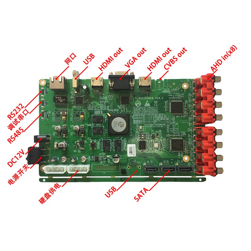 Hi3531DV100標準開發板提供8路AHD模擬高清輸入、8路音頻輸入、HDMI口輸出、USB3.0、USB2.0、SATA、10M/100M/1000網絡、RS232、RS485、GPIO等豐富外圍接口。