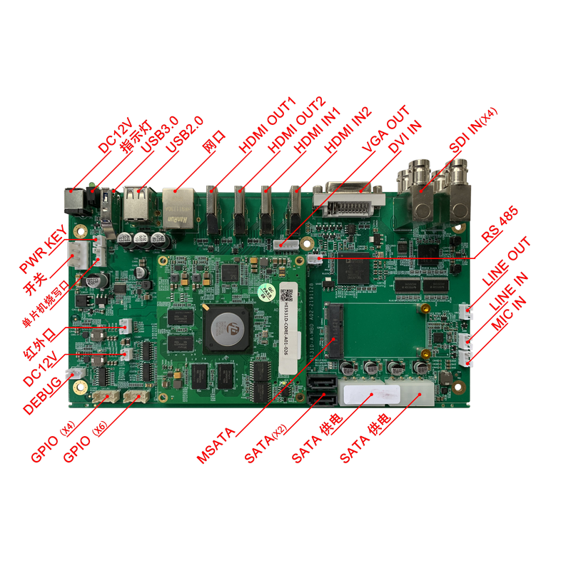 Hi3531DV100定制開發板提供4K@30 HDMI輸入、4K@30 HDMI輸入、4K@30輸出、1080P@60輸出、1080P SDI 輸入、1080P DVI 輸入、 USB3.0、USB2.0、SATA、2路10M/100M/1000網絡、RS232、RS485、GPIO等豐富外圍接口。